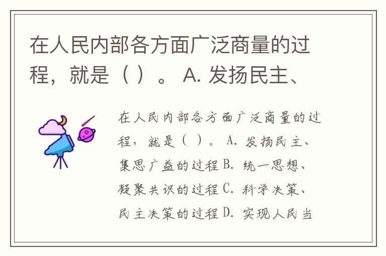 在人民内部各方面广泛商量的过程,就是 A. 发扬民主、集思广益的过程、B. 统一思想、凝聚共识的过程、C. 科学决策、民主决策的过程、D. 实现人民当家作主的过程。