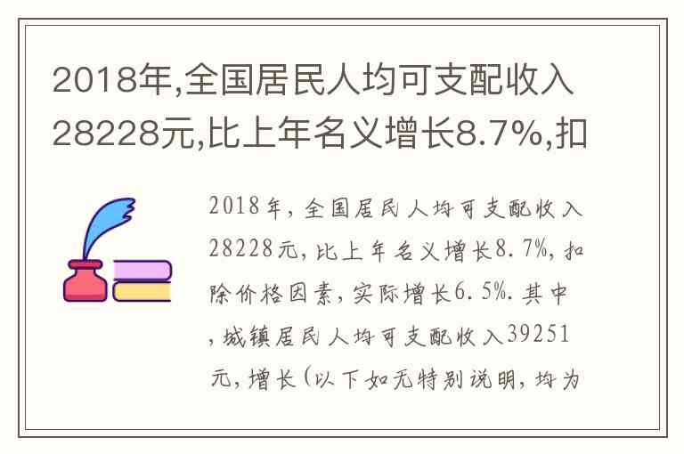 2018年,全国居民人均可支配收入28228元,比上年名义增长8.7%,扣除价格因素,实际增长6.5%.其中,城镇居民人均可支配收入39251元,增长(以下如无特别说明,均为同比名义增长)7.8%,扣除价格因素, 实际增长5.6%;农村居民人均可支配收入14617元,增长8.8%,扣除价格因素,实际增长6.6%。