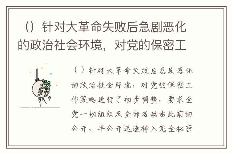 ()针对大革命失败后急剧恶化的政治社会环境,对党的保密工作策略进行了初步调整,要求全党一切组织及全部活动由此前的公开、半公开迅速转入完全秘密状态。