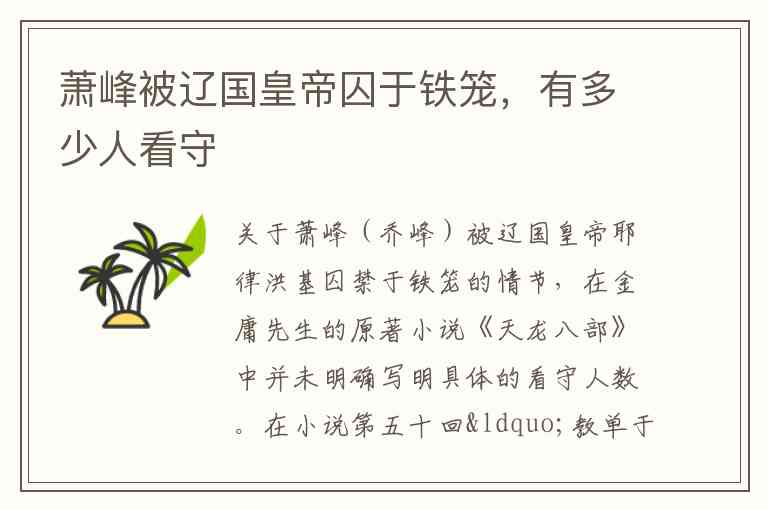 关于萧峰(乔峰)被辽国皇帝耶律洪基囚禁于铁笼的情节,在金庸先生的原著小说《天龙八部》中并未明确写明具体的看守人数。