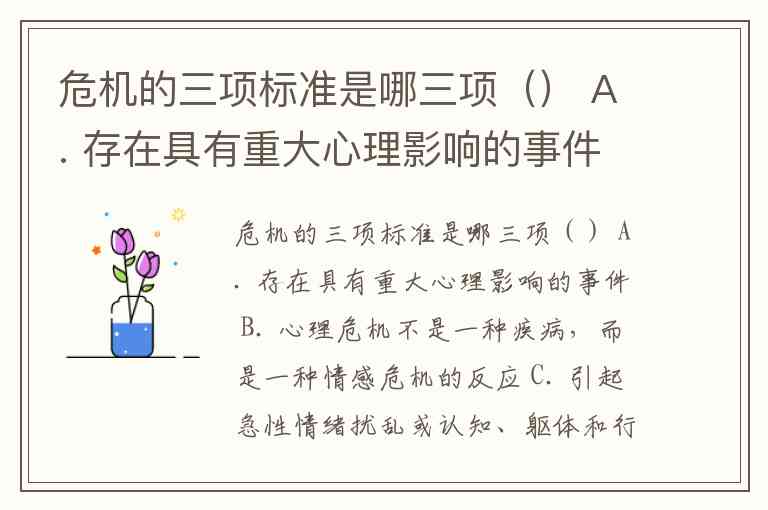 危机的三项标准是哪三项() A. 存在具有重大心理影响的事件 B. 心理危机不是一种疾病,而是一种情感危机的反应 C. 引起急性情绪扰乱或认知、躯体和行为等方面的改变,但又不符合任何精神疾病的诊断 D. 当事人或患者用平常解决问题的手段暂不能应付或应付无效