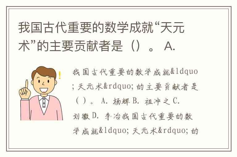 我国古代重要的数学成就“天元术”的主要贡献者是()。 A. 杨辉 B. 祖冲之 C. 刘徽 D. 李冶