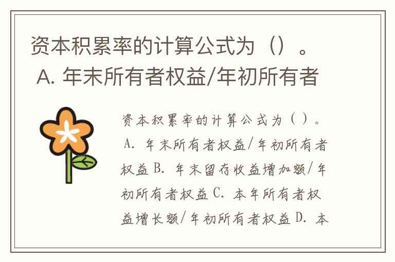 资本积累率的计算公式为()。 A. 年末所有者权益/年初所有者权益 B. 年末留存收益增加额/年初所有者权益 C. 本年所有者权益增长额/年初所有者权益 D. 本年所有者权益增长额/年末所有者权益