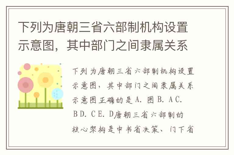 若选项中包含“尚书省→六部”的明确隶属关系,且三省间为平行分权架构(非上下级),即为正确示意。这一制度设计既避免了丞相专权,又通过分层决策与专业执行提升行政效率,其“决策-审议-执行”的逻辑至今影响现代政府架构设计。