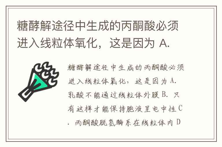 糖酵解途径中生成的丙酮酸必须进入线粒体氧化,这是因为 A. 乳酸不能通过线粒体外膜 B. 只有这样才能保持胞液呈电中性 C. 丙酮酸脱氢酶系在线粒体内 D. 丙酮酸与苹果酸交换