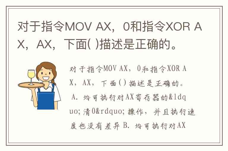 对于指令MOV AX,0和指令XOR AX,AX,下面( )描述是正确的。 A. 均可执行对AX寄存器的“清0”操作,并且执行速度也没有差异 B. 均可执行对AX寄存器的“清0”操作,但MOVAX,0指令的执行速度比较快 C. 均可执行对厶X寄存器的“清0”操作,但XOR AX,AX指令的执行速度比较快 D. 两条指令的执行结果不同