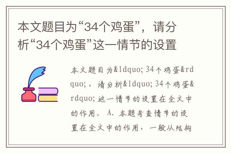 本文题目为“34个鸡蛋”,请分析“34个鸡蛋”这一情节的设置在全文中的作用。 A. 本题考查情节的设置在全文中的作用,一般从结构和内容两个方面去考虑。 B. “34个鸡蛋”这一情节是主人公李暖暖思想感情发生重大转变的重要(关键)情节。 C. 正是孩子们自发送来的34个鸡蛋,深深感动了李暖暖,唤醒她的善良、真诚与爱心,从而让她下决心要留下来兑现她的承诺。