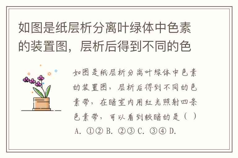 如图是纸层析分离叶绿体中色素的装置图,层析后得到不同的色素带,在暗室内用红光照射四条色素带,可以看到较暗的是( ) A. ①② B. ②③ C. ③④ D. ①④