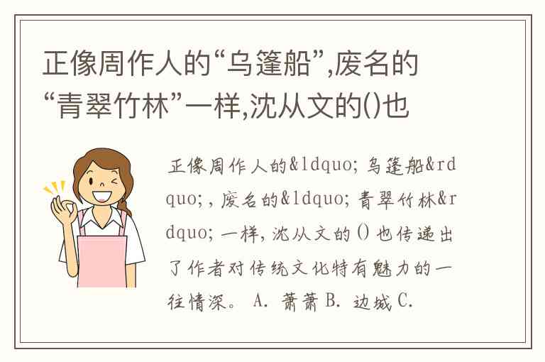 正像周作人的“乌篷船”,废名的“青翠竹林”一样,沈从文的()也传递出了作者对传统文化特有魅力的一往情深。 A. 萧萧 B. 边城 C. 翠翠 D. 祖父
