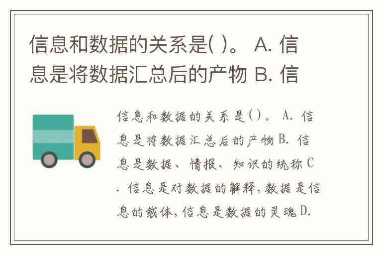 信息和数据的关系是( )。 A. 信息是将数据汇总后的产物 B. 信息是数据、情报、知识的统称 C. 信息是对数据的解释,数据是信息的载体,信息是数据的灵魂 D. 信息就是数据,信息来源于数据,是对数据的加工结果