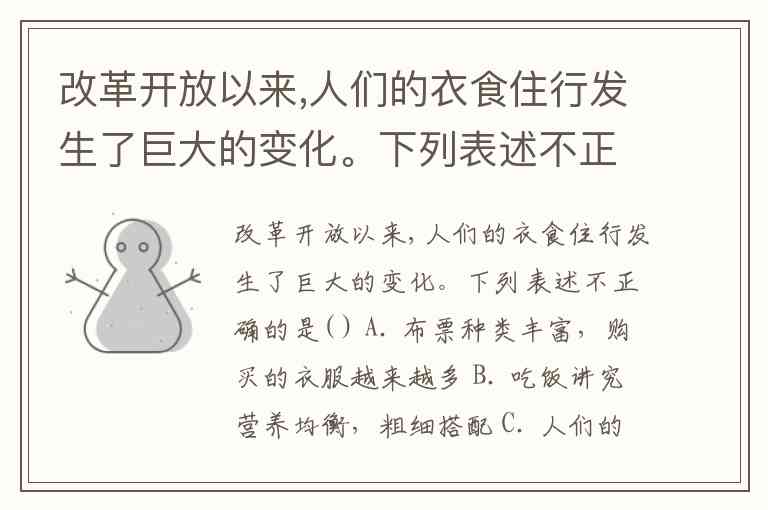 改革开放以来,人们的衣食住行发生了巨大的变化。下列表述不正确的是( ) A. 布票种类丰富,购买的衣服越来越多 B. 吃饭讲究营养均衡,粗细搭配 C. 人们的居住环境有了显著的改善 D. 开私家汽车出行的人越来越多