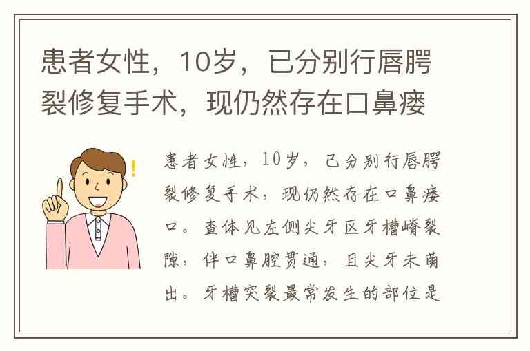 该部位的特殊性还体现在治疗层面:牙槽突植骨术需重点修复此区域,以恢复上颌骨连续性并为尖牙萌出创造条件。了解这一典型解剖位置,对唇腭裂序列治疗中正畸方案设计与植骨时机选择具有重要指导意义。
