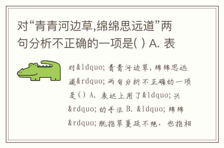 对“青青河边草,绵绵思远道”两句分析不正确的一项是( ) A. 表达上用了“兴”的手法 B. “绵绵”既指草蔓延不绝,也指相思缠绵不断,是双关修辞 C. “远道”指远道之人,是借代修辞 D. “思”用的是拟人的修辞手法