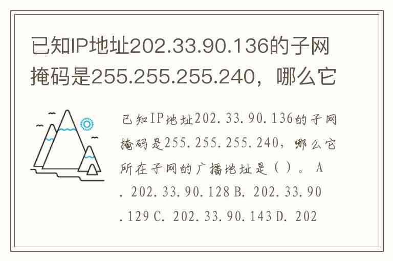 已知IP地址202.33.90.136的子网掩码是255.255.255.240,哪么它所在子网的广播地址是()。 A. 202.33.90.128 B. 202.33.90.129 C. 202.33.90.143 D. 202.33.90.144