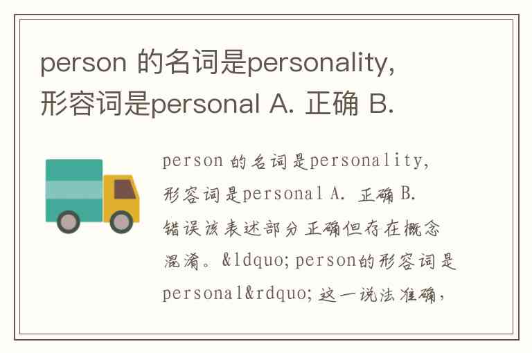该表述部分正确但存在概念混淆。“person的形容词是personal”这一说法准确,例如“personal questions”(私人问题)中,personal直接由person派生而来,表示“个人的、私人的”属性。但**“person的名词是personality”存在逻辑错误**——person本身已是名词(指“人”),而personality是独立名词,意为“个性、人格”,二者是不同概念,并非同一词根的名词形式变化。