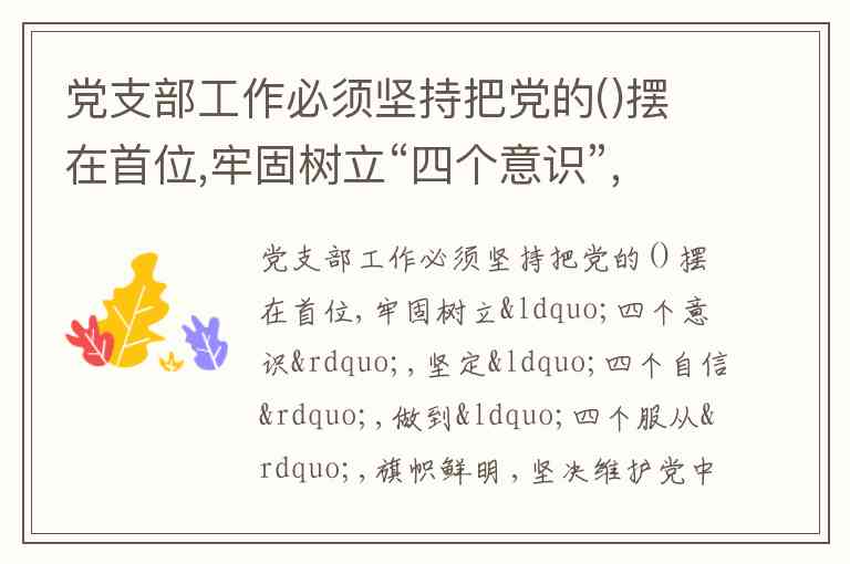 党支部工作必须坚持把党的政治建设摆在首位。这一要求明确写入《中国共产党支部工作条例(试行)》,是新时代党支部建设的根本遵循。政治建设作为党的根本性建设,决定着党支部建设的方向和效果,其核心在于通过牢固树立“四个意识”、坚定“四个自信”、做到“四个服从”,确保党支部始终成为坚决维护党中央权威和集中统一领导的坚强战斗堡垒。