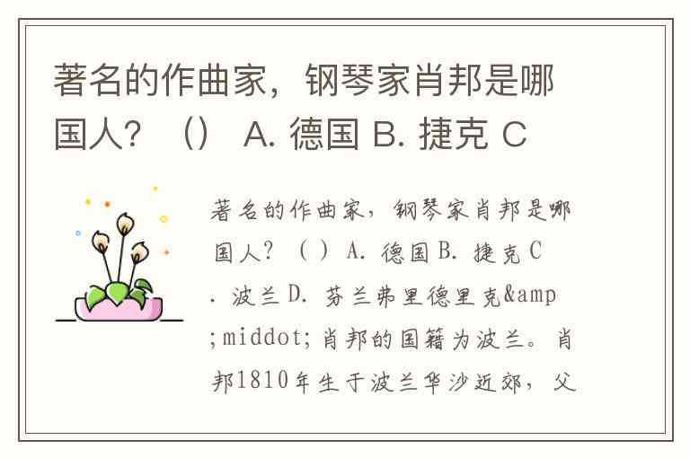 著名的作曲家,钢琴家肖邦是哪国人?() A. 德国 B. 捷克 C. 波兰 D. 芬兰