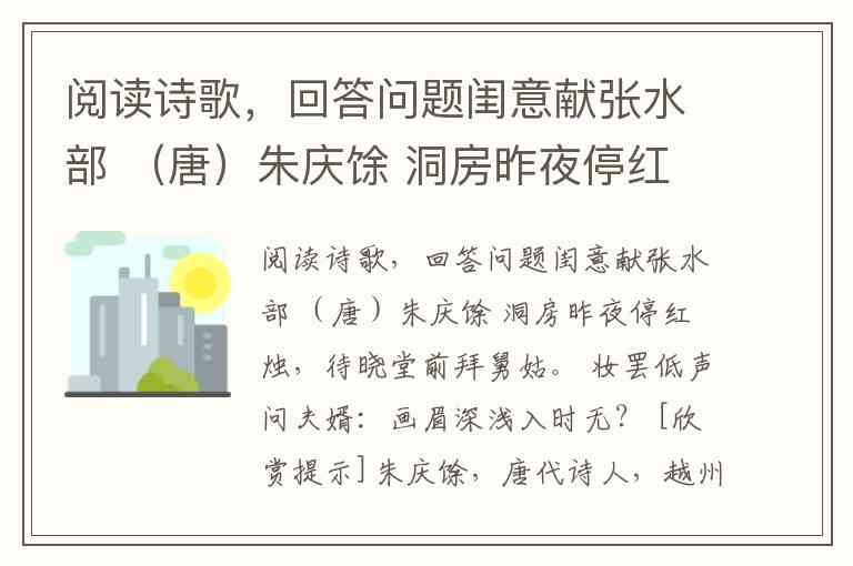 朱庆馀此诗表面写新婚闺意,实则是唐代科举“行卷”文化的经典隐喻。诗人以新妇自比,通过“待晓堂前拜舅姑”的忐忑,暗喻应试举子对主考官员的敬畏;以“低声问夫婿”的娇羞,表达对推荐人张籍的依赖。全诗核心是借闺情传递应试前的不安与期待,而非单纯描摹“闺房之乐”或炫耀才华。