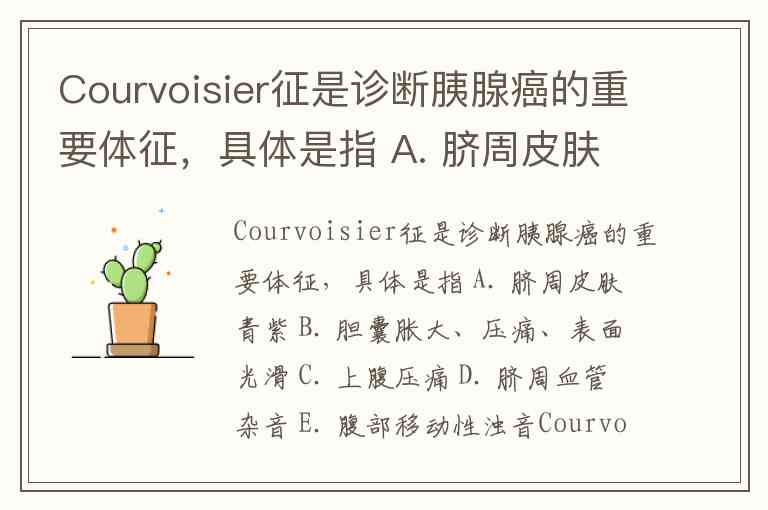 Courvoisier征是诊断胰腺癌的重要体征,具体是指 A. 脐周皮肤青紫 B. 胆囊胀大、压痛、表面光滑 C. 上腹压痛 D. 脐周血管杂音 E. 腹部移动性浊音