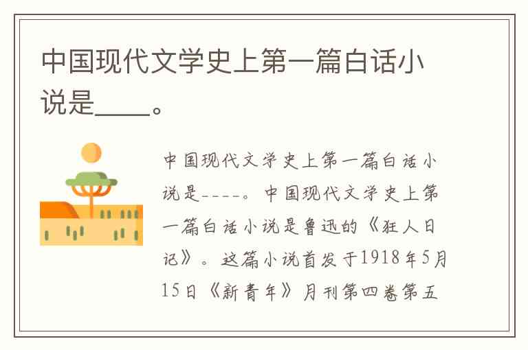 中国现代文学史上第一篇白话小说是鲁迅的《狂人日记》。这篇小说首发于1918年5月15日《新青年》月刊第四卷第五号,后收录于鲁迅的短篇小说集《呐喊》,以被迫害者"狂人"的视角和日记体形式,深刻揭示了封建礼教"吃人"的本质,成为新文化运动中文学革命的里程碑式作品。