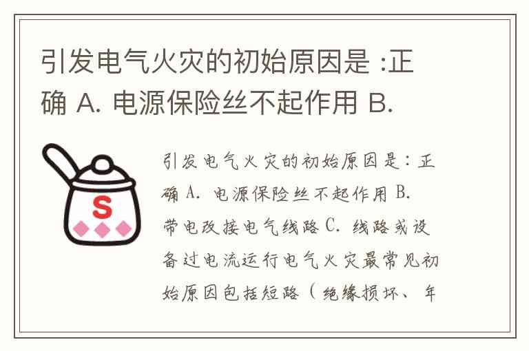 引发电气火灾的初始原因是 :正确 A. 电源保险丝不起作用 B. 带电改接电气线路 C. 线路或设备过电流运行