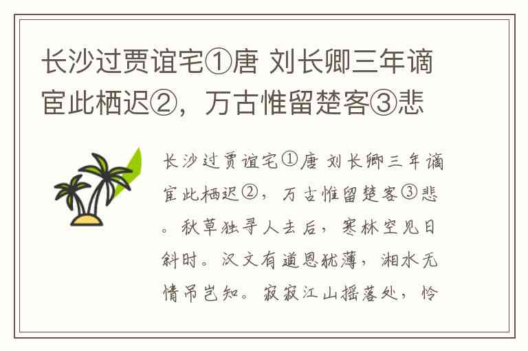 尾联“寂寂江山摇落处,怜君何事到天涯”中,“君”明确指贾谊,诗人通过怜悯贾谊“何事到天涯”的被贬遭遇,实则暗喻自身同样因“刚而犯上”被贬的境遇。这里并非“直抒胸臆发出愤怒的质问”,而是以委婉含蓄的笔法,将对贾谊的同情与自身的不平融为一体,属于“借他人之酒杯,浇胸中之块垒”的间接抒情。同时,诗中并未提及“唐王朝风雨飘摇”,此表述脱离诗歌内容,属于过度解读。尾联的“怜”字更多传递的是悲怆与无奈,而非愤怒。