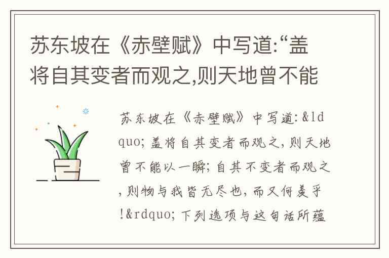苏东坡在《赤壁赋》中写道:“盖将自其变者而观之,则天地曾不能以一瞬;自其不变者而观之,则物与我皆无尽也,而又何羡乎!”下列选项与这句话所蕴含的哲理相似的是( )①镜里朱颜都变尽,只有丹心难灭②文化随着社会生活的发展而发展③文化与政治经济相互交融④不同地区的文化因人们实践活动的不同会有所差异 A. ①③ B. ①④ C. ②③ D. ②④