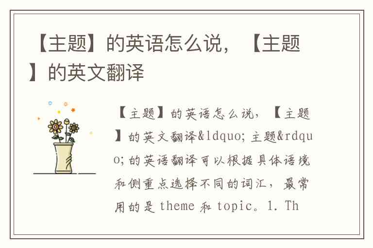 “主题”的英语翻译可以根据具体语境和侧重点选择不同的词汇,最常用的是 theme 和 topic。