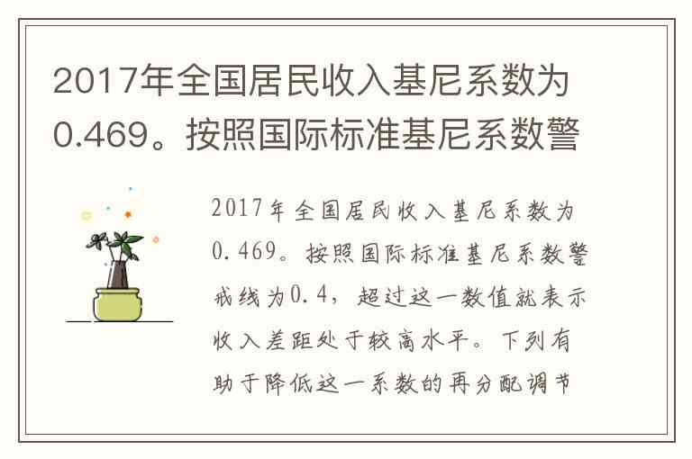 基尼系数是衡量收入分配差距的指标,0.469 已超过国际公认的警戒线 0.4。题中问的是有助于降低基尼系数的再分配调节手段,即应选取能缩小收入差距的政策。