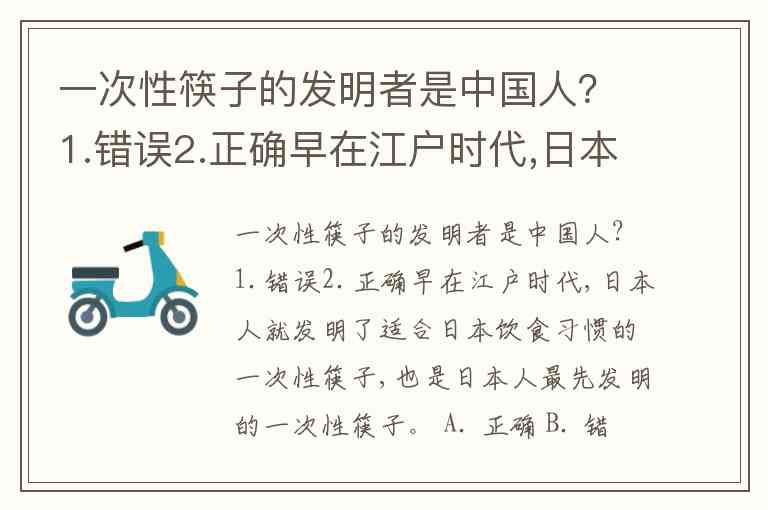 一次性筷子的发明者是中国人?1.错误2.正确早在江户时代,日本人就发明了适合日本饮食习惯的一次性筷子,也是日本人最先发明的一次性筷子。 A. 正确 B. 错误