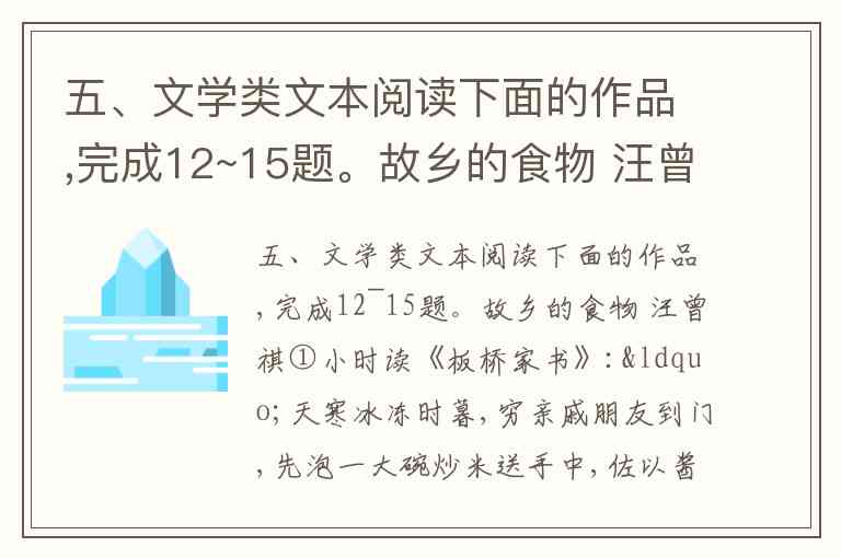 五、文学类文本阅读下面的作品,完成12~15题。故乡的食物 汪曾祺①小时读《板桥家书》:“天寒冰冻时暮,穷亲戚朋友到门,先泡一大碗炒米送手中,佐以酱姜一小碟,最是暖贫之具”,觉得很亲切。郑板桥是兴化人,我的家乡是高邮,风气相似。这样的感情,是外地人们不易领会的。炒米是各地都有的。但是很多地方都做成了炒米糖。四川有“炒米糖开水”,车站码头都有得卖,那是泡着吃的。但四川的炒米糖似也是专业的作坊做的,不像我们那里。我们那里也有炒米糖,像别处一样,切成长方形的一块一块。也有搓成圆球的,叫做“欢喜团”。那也是作坊里做的。但通常所说的炒米,是不加糖黏结的,是“散装”的;而且不是作坊里做出来,是自己家里炒的。②说是自己家里炒,其实是请了人来炒的。炒炒米也要点手艺,并不是人人都会的。入了冬,大概是过了冬至吧,有人背了一面大筛子,手执长柄的铁铲,大街小巷地走,这就是炒炒米的。有时带一个助手,多半是个半大孩子,是帮他烧火的。请到家里来,管一顿饭,给几个钱,炒一天。或二斗,或半石;像我们家人口多,一次得炒一石糯米。炒炒米都是把一年所需一次炒齐,没有零零碎碎炒的。过了这个季节,再找炒炒米的也找不着。一炒炒米,就让人觉得,快要过年了。幼年时的记忆技巧以及对于中国传统文化的烂熟于心也在日后帮助源开创自己的棋风。当他7岁开始学棋时,对于打谱学棋已自觉不累,而“礼之用,和为贵”“致中和”“过犹不及”“君子矜而不争”等中国传统文化基因也一直影响着他的围棋观。他4岁开始学习《大学》《中庸》等,直至晚年仍坚持每天研究《易经》,汲取理念打造“六合之棋”。对于名利,源没有任何欲念,他的世界就存在于纹枰之上的方寸之间。即便谈及“棋圣”的殊荣,源的回应也简单至极,“我个人不认为自己是棋圣。人来到的世间就有自己的任务,活在世间,就要为自己的任务去努力”。如果说对于一心追求棋力的棋士来说,抛弃名利尚且可以理解,那么对于胜负的寡淡或许才是普通棋手和一代大师之间不甚明晰的鸿沟。他说“胜与负,不是我下得好还是不好,而是我还能不能下得更好”。源一直说,“信仰与围棋犹如车之两轮,缺一不可”。“我的感觉是,事实上是什么宗教对他来说是不太重要的,但信仰本身对他很重要。”弟子芮乃伟如是说。“他谈到佛教与神道各派的异同,令我十分惊异。他认为修养之道,是为了使自己的灵智澄静明澈。”川端康成如此解读源执着于信仰的原因。源追寻“中的精神”,他自己解读说“中字左右分别代表阴和阳,而阴阳平衡的那一点正好是‘中’。在围棋上,要思考‘中’的那一点,中和棋盘上各子作用的那一点。”对他来说,棋是“武”的胜负世界,宗教是“文”的和平世界。文武双修,在内心同时涵蓄战争与和平这两个截然相反的境界,并且取得两者的平衡,正好显示源始终还是一个深受传统文化影响的中国人。注释:源先生把“21世纪的围棋”称作“六合之棋”。所谓“六合”,在古文里是宇宙的意思,表示东西南北的四方和上下的天地,围棋的目标不是局限于边角,而是应该很好地保持全体的平衡,每一手必须是考虑全盘整体的平衡去下。(1)下列对材料有关内容的分析和概括,正确的一项是 A. 川端康成了解源的家世及其生平,他写到源“手指修长,脖颈白晳,使人感到他具有贵族的睿智和哀愁”。 B. 源的父亲吴毅留学日本,放弃了自己本来的专业,在那里爱上了围棋,并带回了大量的围棋书籍,这些极大地影响了源。 C. 源在“昭和”时代创造了包涵天地自然意蕴的“六合棋”,因而被称为“昭和棋圣”。 D. 文章多处引用源自己的话,直接展示传主的精神,真实可信且更具感染力。