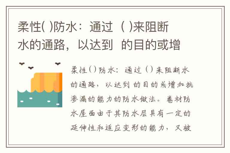 柔性(防水材料)防水:通过(设置柔性防水层)来阻断水的通路,以达到(防止水分渗透)的目的或增加抗渗漏的能力的防水做法。卷材防水屋面由于其防水层具有一定的延伸性和适应变形的能力,又被称作柔性防水屋面。