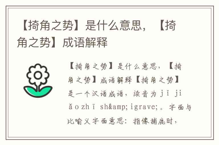 误写:易误写为“犄角之势”。“犄角”通常指动物头角或角落,虽读音相同且也有“分兵牵制”的用法,但成语的标准写法是 “掎角之势”。
