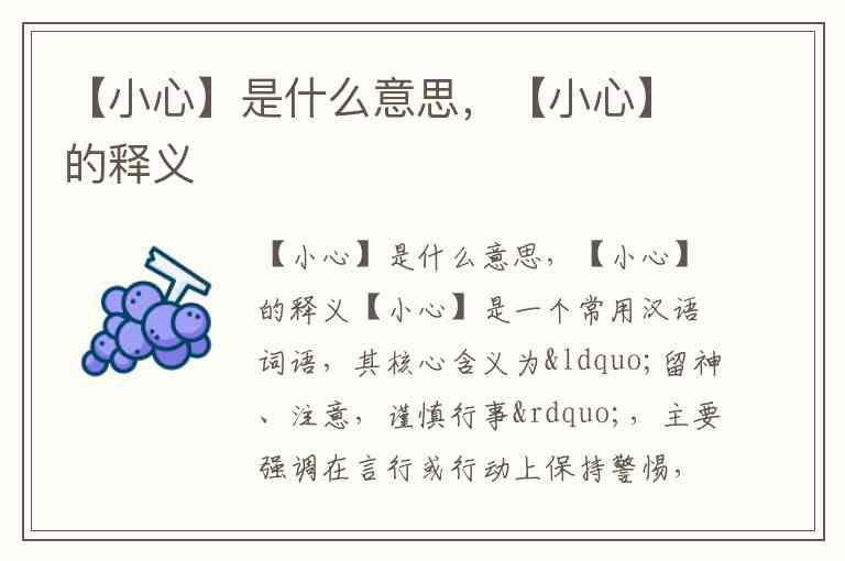 【小心】是一个常用汉语词语,其核心含义为“留神、注意,谨慎行事”,主要强调在言行或行动上保持警惕,以避免错误或危险。
