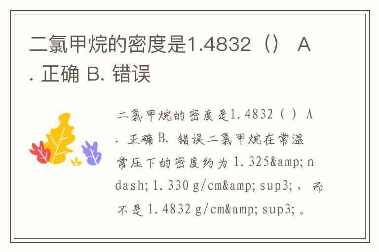 二氯甲烷在常温常压下的密度约为 1.325–1.330 g/cm³,而不是 1.4832 g/cm³。