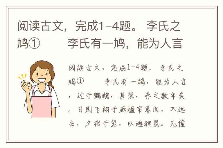 阅读古文,完成1-4题。 李氏之鸠① 李氏有一鸠,能为人言,过于鹦鹉,甚慧,养之数年矣。日则飞翔于廊楹帘幕间,不远去,夕宿于笼,以避狸鼠。见僮婢②有私持物及摘花者,必告其主人。 晋人贾③于吴者,见之,愿以十金易④焉。鸠觉其意,告主人曰:“我居此久,不忍去。公必欲市我他所,我且不食。”主人绐⑤之曰:“我友有欲观汝者,即携汝归耳。”至贾家,则舍之去。鸠竟不食,哀号告归。贾人怜其志,且恐鸠死而金无取偿也,遂捐金十之二,而以鸠还李氏。鸠乃食。 注:①鸠(jiū):鸟中的一种。②僮婢:僮仆婢女。③贾:做买卖。④易:交换。⑤绐(dài):哄骗。1、按要求完成下列两题。(1)解释加粗的词语。①过于鹦鹉,甚慧 慧_________②鸠觉其意 意_________③至贾家,则舍之去 去_________④鸠竟不食 竟_________(2)与例句中的“以”意思相同的一项是( )例句:愿以十金易焉