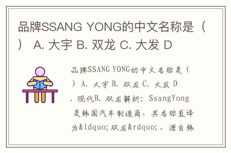 品牌SSANG YONG的中文名称是() A. 大宇 B. 双龙 C. 大发 D. 现代
