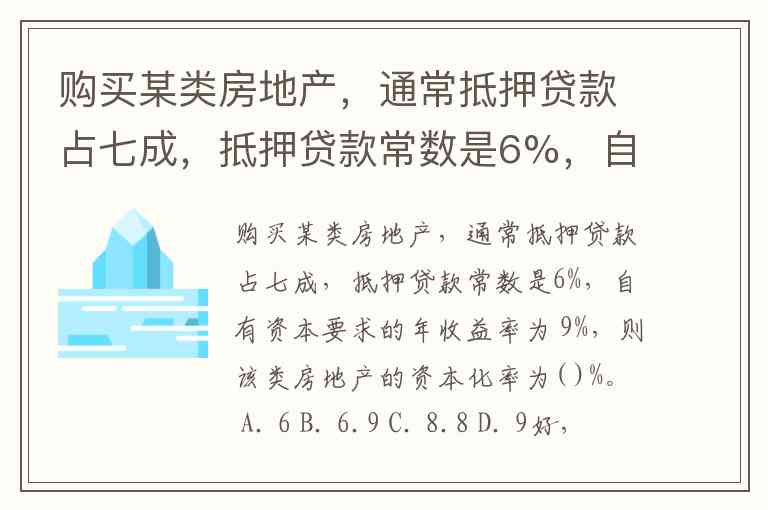 购买某类房地产,通常抵押贷款占七成,抵押贷款常数是6%,自有资本要求的年收益率为 9%,则该类房地产的资本化率为( )%。 A. 6 B. 6.9 C. 8.8 D. 9