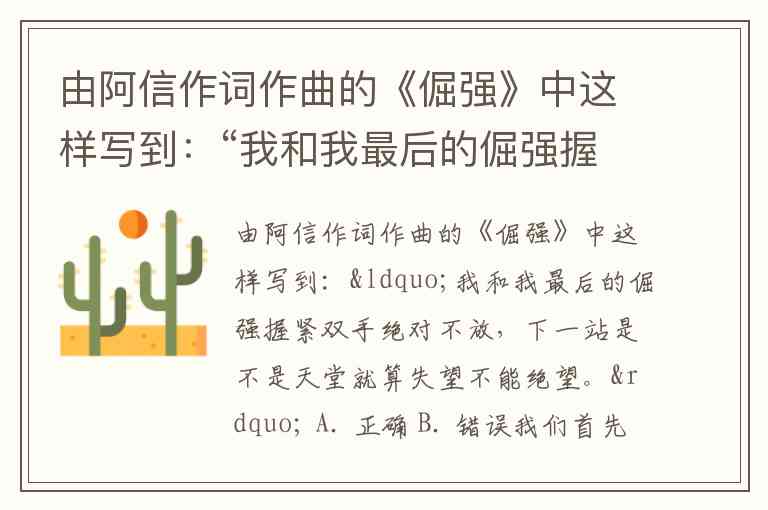 由阿信作词作曲的《倔强》中这样写到:“我和我最后的倔强握紧双手绝对不放,下一站是不是天堂就算失望不能绝望。” A. 正确 B. 错误