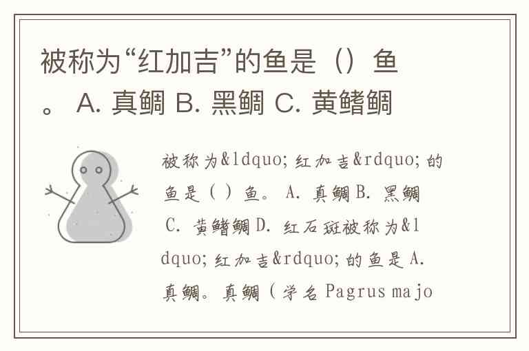 被称为“红加吉”的鱼是()鱼。 A. 真鲷 B. 黑鲷 C. 黄鳍鲷 D. 红石斑