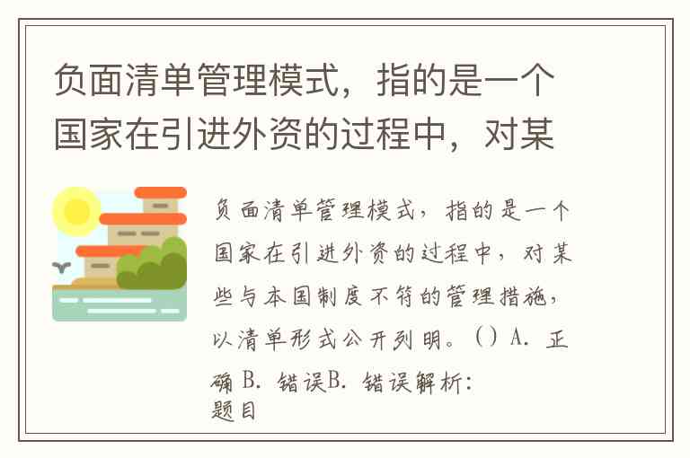 负面清单管理模式,指的是一个国家在引进外资的过程中,对某些与本国制度不符的管理措施,以清单形式公开列明。( ) A. 正确 B. 错误