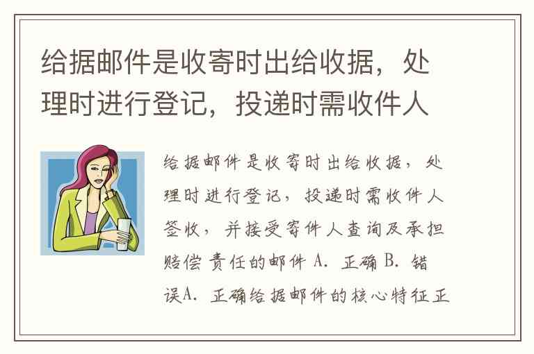 给据邮件是收寄时出给收据,处理时进行登记,投递时需收件人签收,并接受寄件人查询及承担赔偿 责任的邮件 A. 正确 B. 错误