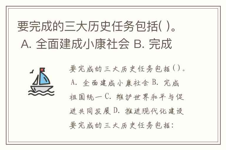 要完成的三大历史任务包括( )。 A. 全面建成小康社会 B. 完成祖国统一 C. 维护世界和平与促进共同发展 D. 推进现代化建设