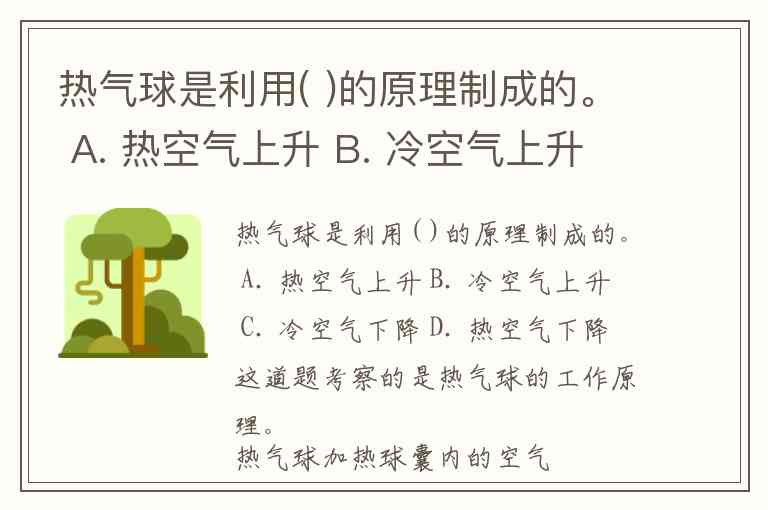 热气球是利用( )的原理制成的。 A. 热空气上升 B. 冷空气上升 C. 冷空气下降 D. 热空气下降