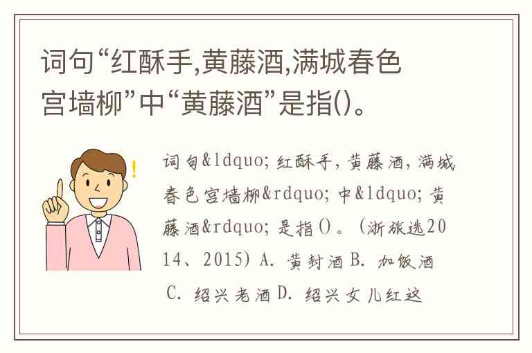 词句“红酥手,黄藤酒,满城春色宫墙柳”中“黄藤酒”是指()。(浙旅选2014、2015) A. 黄封酒 B. 加饭酒 C. 绍兴老酒 D. 绍兴女儿红