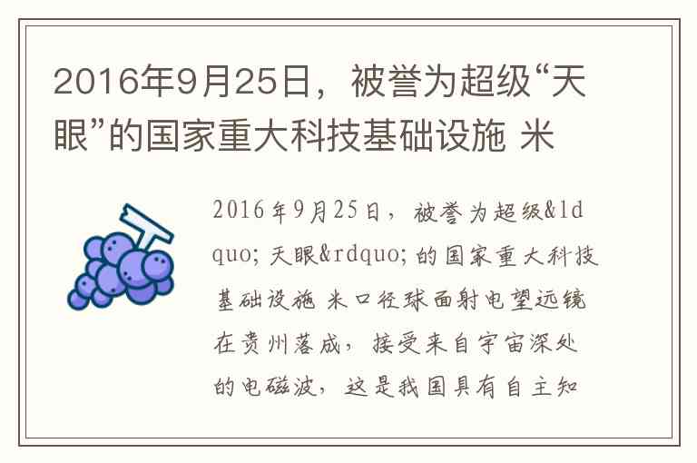 2016年9月25日,我国在贵州建成的世界最大单口径射电望远镜,其口径为 500 米,全称是“500米口径球面射电望远镜”(Five-hundred-meter Aperture Spherical Telescope,简称 FAST)。