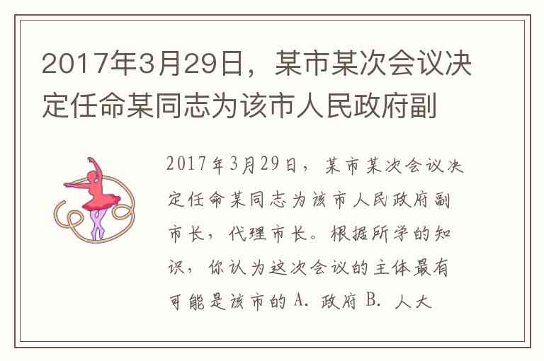 2017年3月29日,某市某次会议决定任命某同志为该市人民政府副市长,代理市长。根据所学的知识,你认为这次会议的主体最有可能是该市的 A. 政府 B. 人大常委会 C. 人民政协 D. 人民检察院
