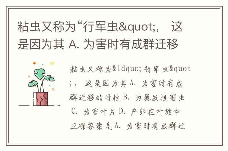 粘虫又称为“行军虫", 这是因为其 A. 为害时有成群迁移的习性 B. 为暴发性害虫 C. 为害叶片 D. 产卵在叶缝中