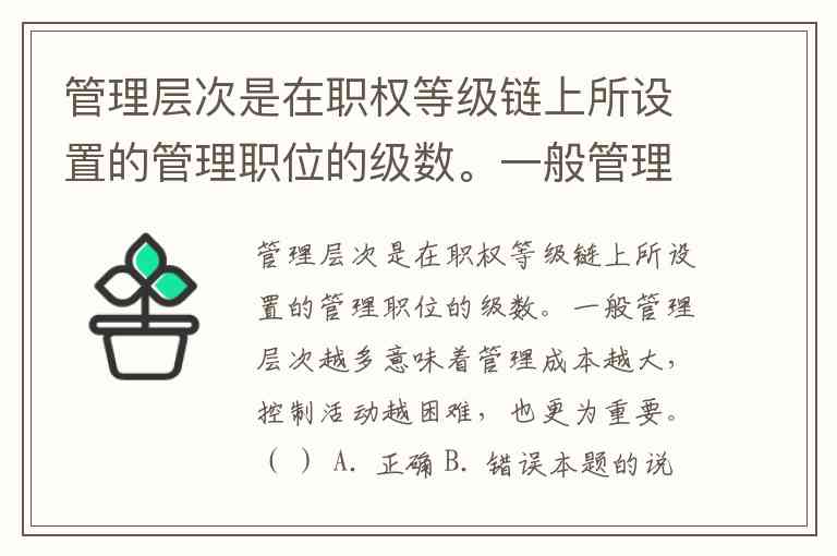 管理层次是在职权等级链上所设置的管理职位的级数。一般管理层次越多意味着管理成本越大,控制活动越困难,也更为重要。( ) A. 正确 B. 错误