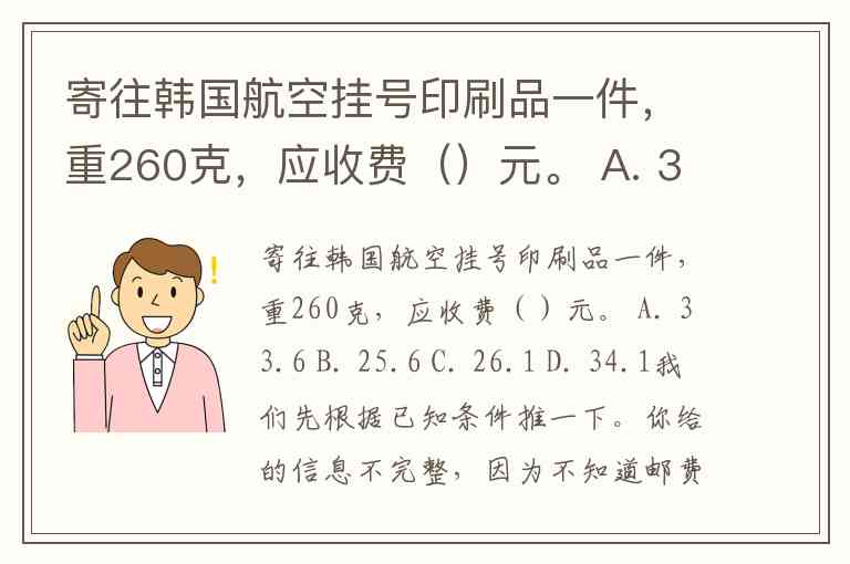寄往韩国航空挂号印刷品一件,重260克,应收费()元。 A. 33.6 B. 25.6 C. 26.1 D. 34.1